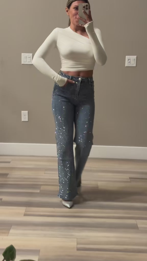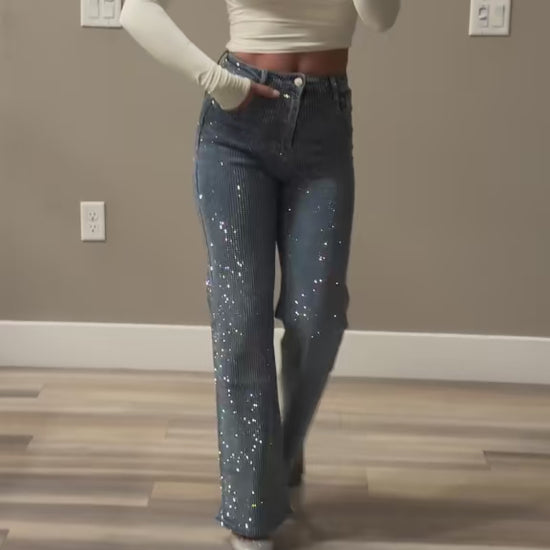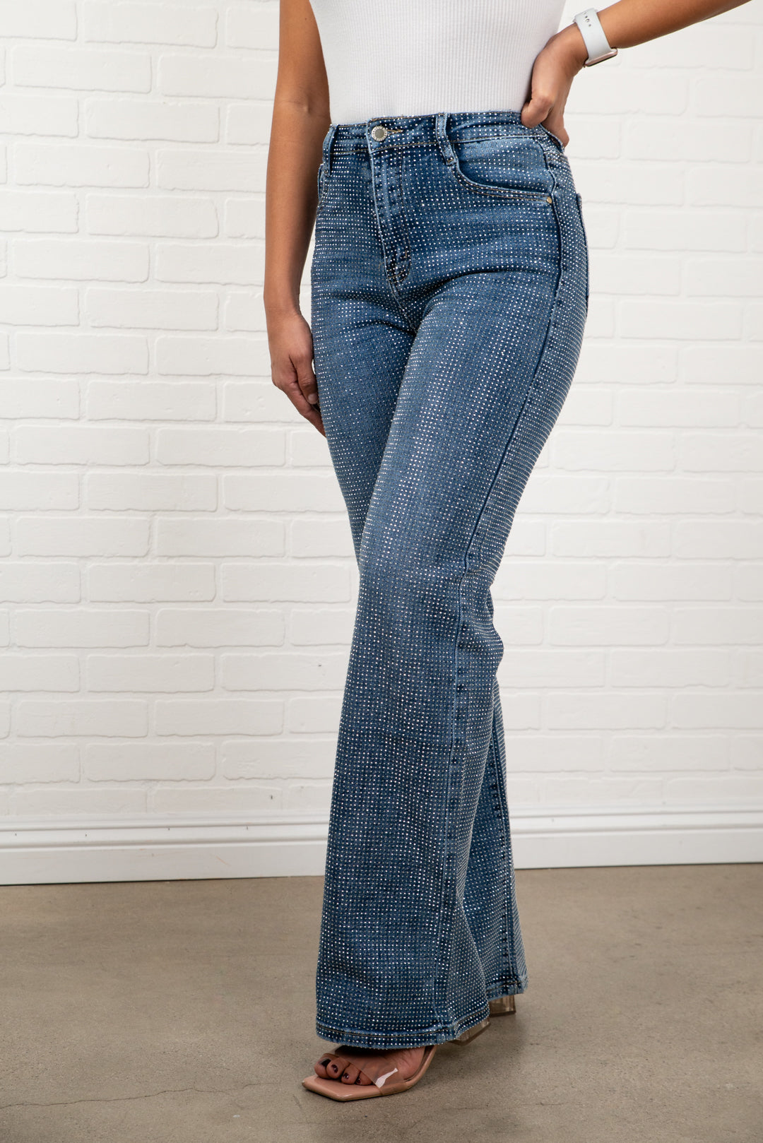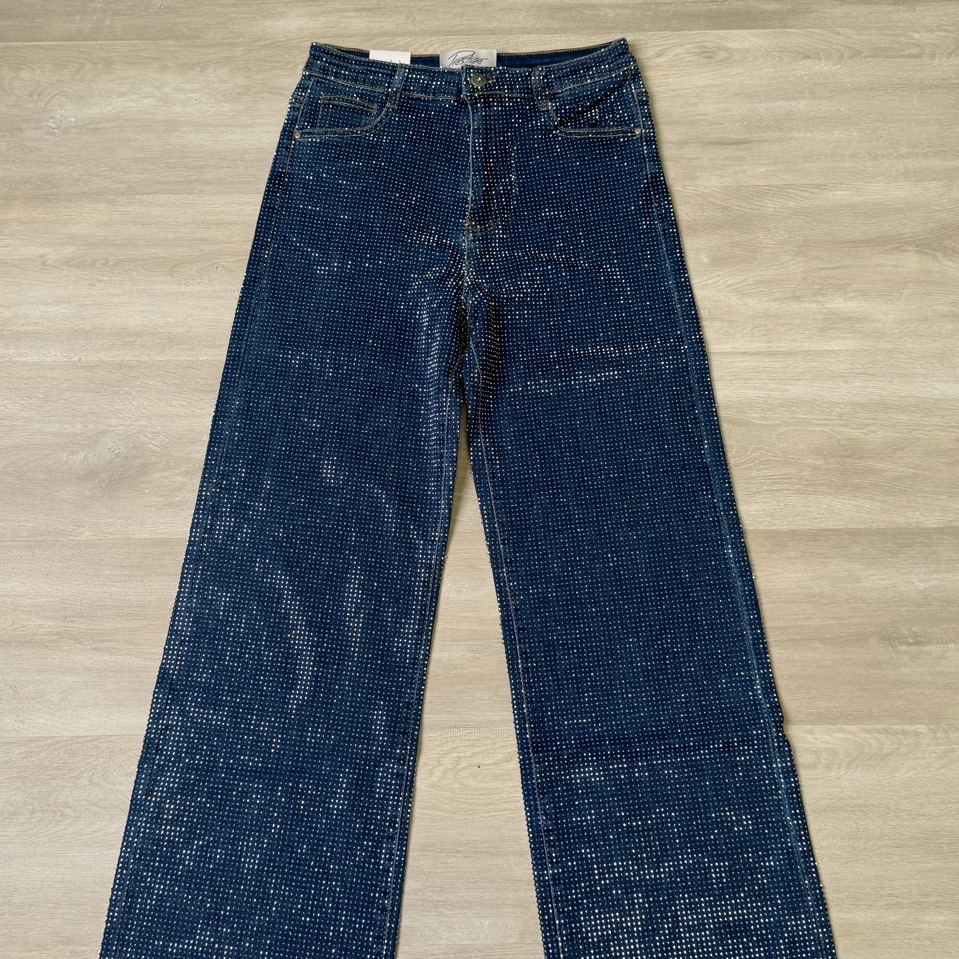 Elevate your denim game with these stunning Angel straight leg jeans featuring full rhinestone embellishments that catch the light with every move. The high-waisted silhouette flatters your figure while the crisp light wash keeps things fresh and versatile. Perfect for turning heads at any occasion—whether you're dressing up for a night out or adding sparkle to your everyday look. These aren't just jeans; they're a statement piece that says you've got style and confidence to spare.